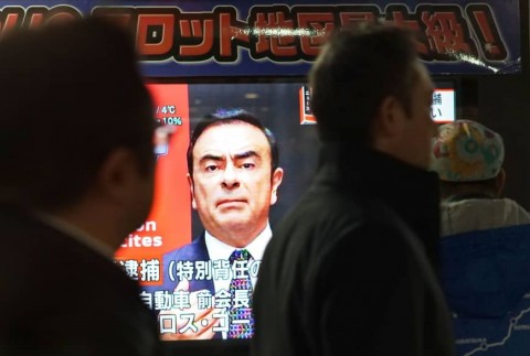A television screen shows a news program featuring former Nissan chief Carlos Ghosn in Tokyo on Friday. On the same day, Japanese prosecutors re-arrested Ghosn on new charges. Image: AFP-JIJI