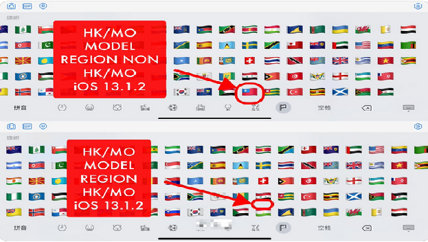 由於蘋果公司靠中國工廠生產零主件,因此在香港、澳門出售的手機移除台灣的國旗。